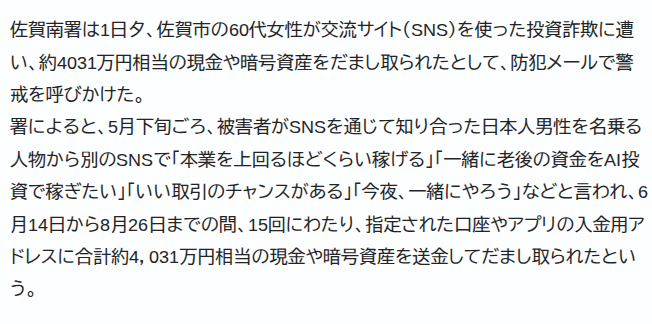 画像出典:西日本新聞「佐賀市の60代女性がSNS型投資詐欺で4031万円被害 「一緒に老後の資金をAI投資で稼ぎたい」と誘われる」